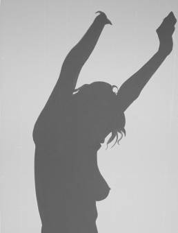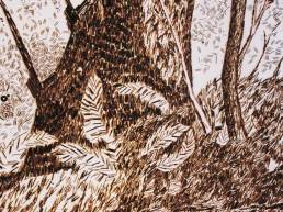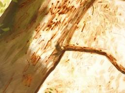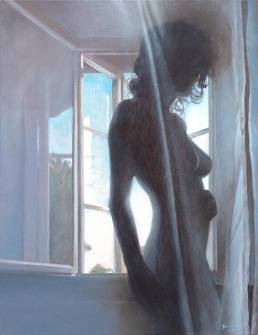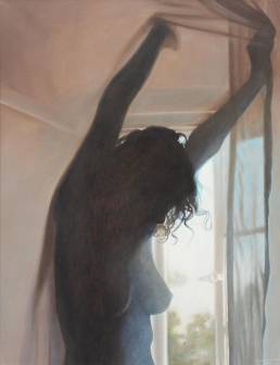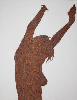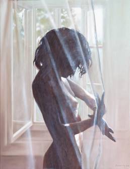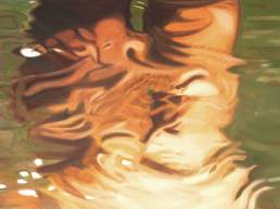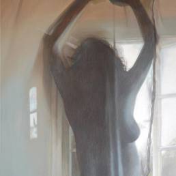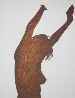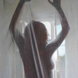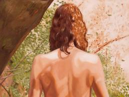 On the light gray primed canvas, a body silhouette was created with iron pigment paint. Nails were then laid out on it and kept moist with water. Rust forms and then almost completely disappears under the scenic representation painted with oil paint, just as our knowledge of transience fades away in the rush of the present moment.