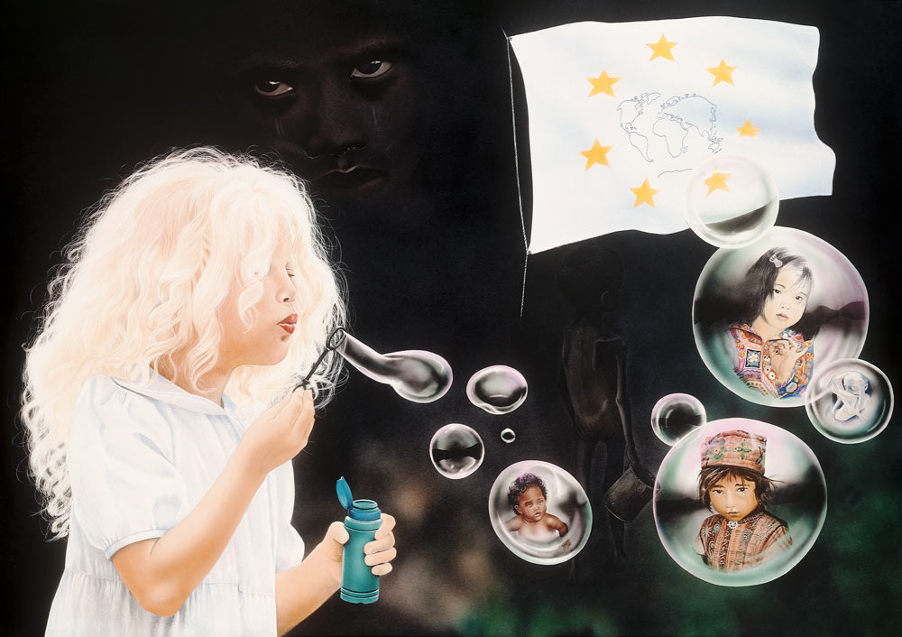 In the summer of 1995, the artist couple decided to accept an offer for a large-scale art exhibition. This provided them with the opportunity to combine art with peace and to highlight the creative power of children. Frank developed the installation “Many Children One World,” consisting of his newly created World Peace Flag, eight large-scale children’s portraits, and a sound collage. The exhibition “Hungry Hearts” was realized with three other artists in the transition between 1995 and 1996 and was a great success, attracting over 3000 visitors aged 8 to 88. Many of the exhibition visitors participated in a marketing survey, the result of which was clear. The installation “Many Children One World” was chosen as the most popular artwork of the exhibition. This encouraged Frank to follow his vision and further promote the idea of “Many Children One World.”