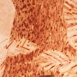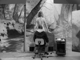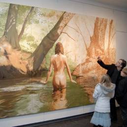 On the light gray primed canvas, a body silhouette was created with iron pigment paint. Nails were then laid out on it and kept moist with water. Rust forms and then almost completely disappears under the scenic representation painted with oil paint, just as our knowledge of transience fades away in the rush of the present moment.