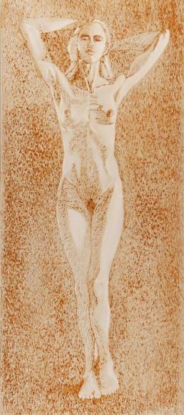 For several years, the versatile artist has been working with rust as a symbol of transience. To this end, he develops new painting techniques in which controlled iron oxidation leaves traces on the painting surface. For individual pieces, he might, for example, embed thousands of rusty nails into the shape of his subject, keeping them moist for weeks to allow the imprint of rust to form on the canvas. Contrasting this visible process of decay, symbolizing all things finite, Rosenzweig incorporates blossoms and nudes representing youth, health, beauty, and the fleeting moment of existence. In doing so, he engages in a dialogue with the tradition of Vanitas painting (Vanitas: empty appearance, vanity), confronting the finite nature of human existence.